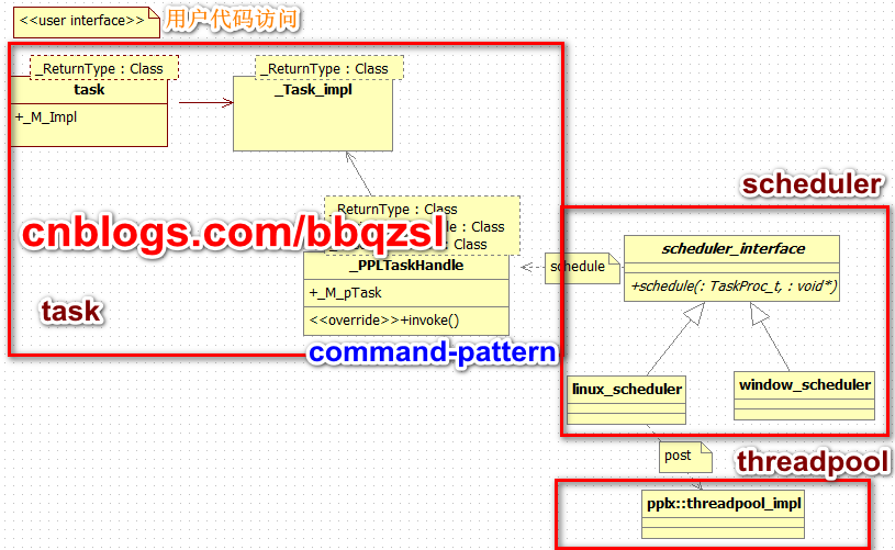 三者關係如上圖示,pplx只着重實現了task部分功能,scheduler跟threadpool只是簡略實現。