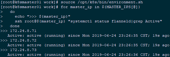 1 [root@k8smaster01 ~]# source /opt/k8s/bin/environment.sh 2 [root@k8smaster01 ~]# for master_ip in ${MASTER_IPS[@]} 3 do 4 echo ">>> ${master_ip}" 5 ssh root@${master_ip} "systemctl status flanneld|grep Active" 6 done