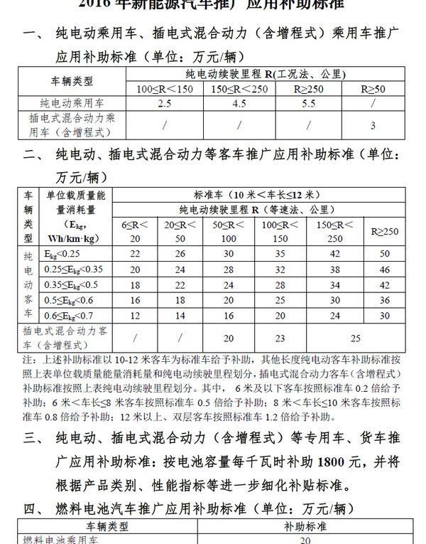根據財政部此前發佈的《關於2016-2020年新能源汽車推廣應用財政支持政策的通知》,2016年乘用車以純電動續航行駛里程(R)為標準,具體補貼如下。