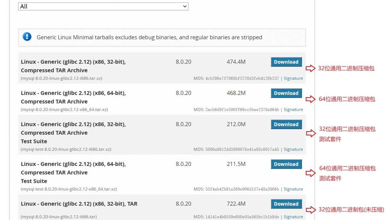 首先要選定操作系統平台,我這邊是CentOS8.1 x86_64位架構,那我要選Linux版本的,最好是CentOS專用的!結果找了一圈暫時還沒有CentOS專用的版本(RedHat專用版本到是有,其實我們知道CentOS是就源自RedHat)…為了保險起見,我們選Linux通用版(Linux-Generic),結果出來的列表也不少!這麼多都是些啥,見圖標解吧: