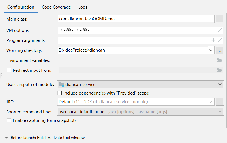 我們為了讓程序運行時,快速的拋出OutOfMemoryError異常,可以在java的啟動命令行增加啟動參數,設置堆內存的初始值和最大值。這兩個值在生產環境下,通常也是要配置的哦,要充分利用機器的內存嘛,如果不配置就會使用默認值。到時候由於內存不足向老闆申請機器,可別挨罵哦~