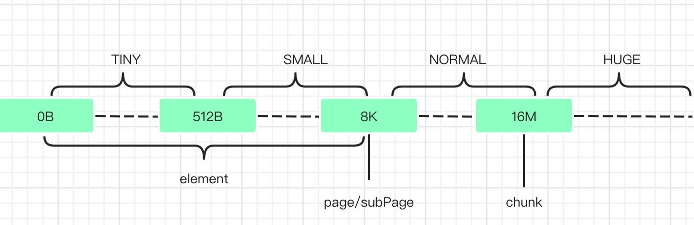 每個線程各種保存 Arena 和緩存池信息,這樣可以減少競爭並提高訪問效率。Arena 將內存分為很多 Chunk 進行管理,Chunk 內部保存 Page,以頁為單位申請。申請內存分配時,會將分配的規格分為幾類:TINY,SAMLL,NORMAL 和 HUGE,分別對應不同的範圍,處理過程也不相同。