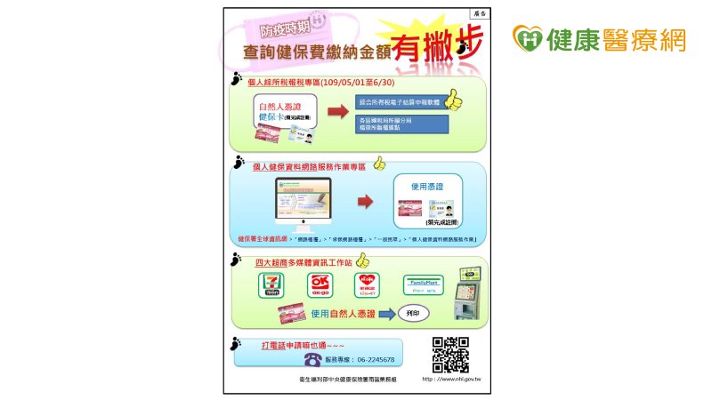 健保署南區業務組表示,在防疫期間,查詢或申請健保費金額有撇步,可利用個人憑證(已完成註冊的健保卡或自然人憑證),上網連結財政部電子申報繳稅服務網(https://tax.nat.gov.tw) 的「個人綜所稅報稅」專區、或至健保署全球資訊網 (https://www.nhi.gov.tw) 點選「個人健保資料網路服務作業」專區,或前往四大超商的多媒體資訊工作站,直接查詢或列印健保費金額。如果無法使用網路平台查詢,也可電話撥打南區業務組服務專線06-2245678洽詢,不用親自臨櫃,便利又安全。