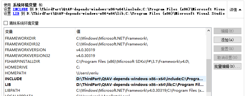 圖中環境變量列表中加粗的字即是我添加的環境變量,msvc編譯器下INCLUDE和LIB這個兩個變量本身就是存在的,所以我們只需要在值那一列把include和lib目錄添加上即可。