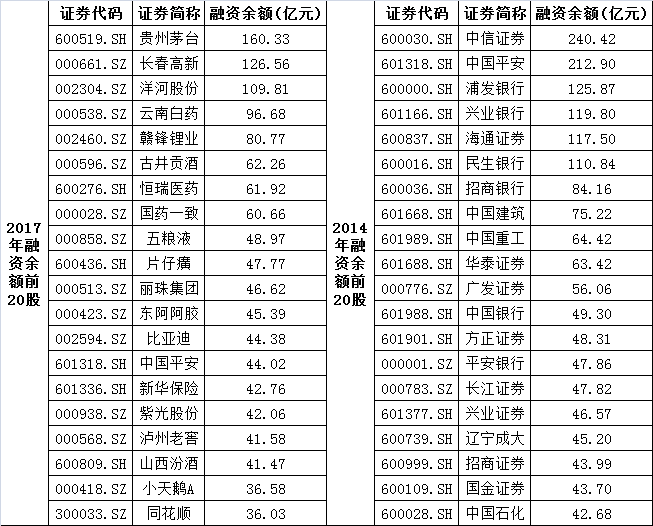 截取突破萬億當日融資餘額較高的前20股分析來看,2014年融資餘額突破萬億時,融資客重倉券商和銀行股,融資餘額前20個股中,有9隻屬券商股,佔比45%,銀行股有6隻,佔比30%。時過境遷,2017年,兩融重倉風格相對於2014年風格大變,白酒和醫藥股受融資客歡迎,融資前20隻個股中,醫藥股有7隻,白酒股有6隻。