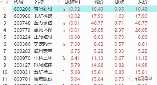 今日早盤,稀土板塊再度走強,截至午間收盤,金力永磁正海磁材有研新材北礦科技等5股漲停,寧波韻升銀河磁體中科三環等漲幅居前。