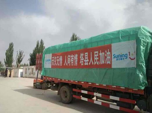 2017年5月11日5時58分,新疆喀什地區塔什庫爾干塔吉克自治縣發生5.5級地震並造成人員傷亡,災情波及1.2萬人。地震發生后新疆蘇寧立刻啟動應急救災物資,第一時間聯繫了喀什當地的工作人員緊急採購救援物資併火速安排車輛進行運輸。當得知災區被安置居民住在臨時搭建的帳篷內,保暖是個大問題時,新疆蘇寧立即做出反應,加急採購了棉被等防寒保暖物資,馬不停蹄地送往災區,全力保障受災群眾免受凍餓之苦。