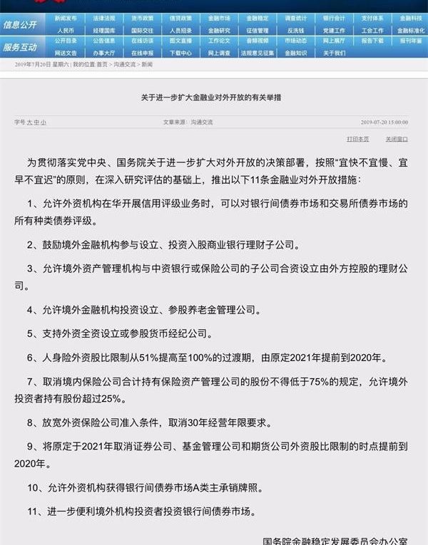 7月20日,國務院金融穩定發展委員會辦公室公布了11條最新的金融業對外開放措施,更大程度、更大便利地歡迎外資參与中國金融市場。