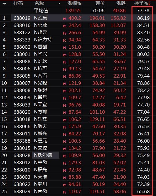科創板全天換手率奇高,有6隻股票換手達80%以上,最高換手率股票仍是安集科技,換手高達86.19%。