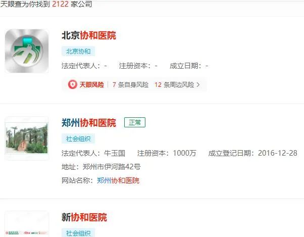 但誰能想到,這年頭,竟然連醫院也可以是仿冒的。以“協和醫院”為例,在天眼查上搜索,竟有多達2122家,其範圍之廣,布局之深,不管身處幾線城市,不管位置多偏遠,總有一家協和醫院等着你。