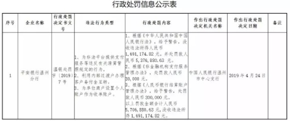 近日,根據中國人民銀行溫州市中心支行發布行政處罰信息公示表显示,平安銀行溫州支行因為非法平台提供支付服務等違反有關清算管理規定的行為,利用內部過渡戶辦理客戶備付金互轉,為單位商戶設置個人賬戶作為收單賬戶的違法違規行為被中國人民銀行溫州市中心支行罰款金額合計人民幣5,706,880.63元,沒收違法所得1,691,174.82元,累計罰沒總計7,398,055.45元。