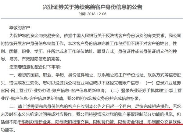 興業證券相關負責人對記者表示,興業證券早在2018年12月即通過公司官網、投教基地公眾號、交易軟件公告等渠道向客戶發布《興業證券關於持續完善客戶身份信息的公告》,要求客戶及時完成身份信息完善工作,包括但不限於補充客戶的姓名、性別、國籍、職業、學歷、住所地或者工作單位地址、聯繫方式,身份證件或者身份證明文件的種類、號碼、有效期限信息。同時要求分支機構积極通知客戶,對存量自然人、非自然人賬戶進行整改,目前已對部分未按要求完成整改的不規範賬戶進行限制。
