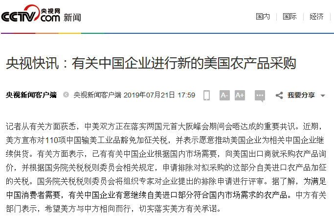 摘要 【央視:有關中國企業進行新的美國農產品採購】據了解,為滿足中國消費者需要,有關中國企業有意繼續自美進口部分符合國內市場需求的農產品。中方有關部門表示,希望美方與中方相向而行,切實落實美方有關承諾。(央視新聞)