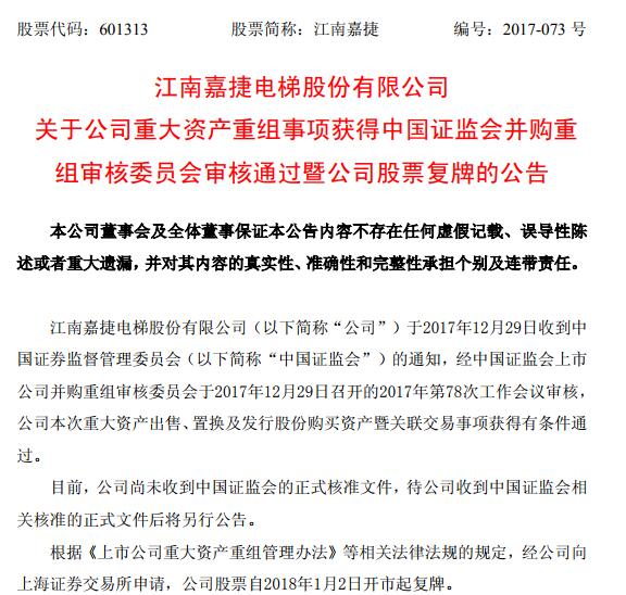 12月29日,江南嘉捷公告,重大資產重組事項獲得證監會併購重組審核委員會審核通過,公司股票自2018年1月2日開市起複牌。
