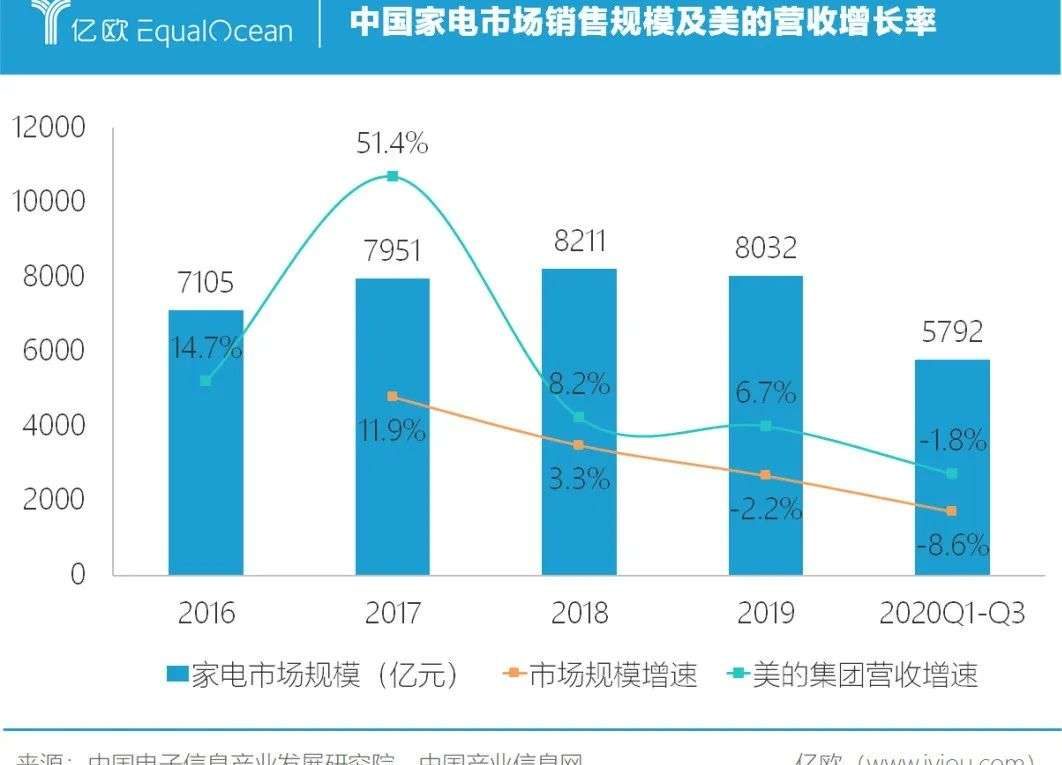 美的集團的營業收入也與家電市場的繁榮程度緊密關聯。2017年其營收突破2000億元,同比增長高達51.3%,但2018年起增速逐年下降,2020年前三季度同比下降1.81%。