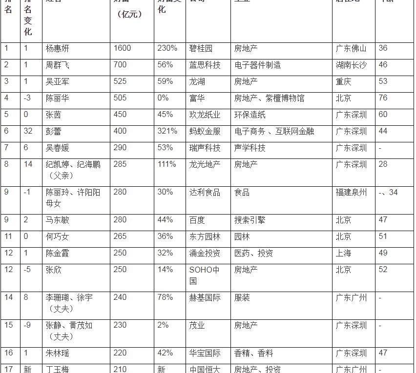36歲楊惠妍以財富1600億元繼2014年之後第五次成為中國女首富;“觸屏女王”46歲周群飛以700億元排名第二,而第二次成為全球白手起家女首富;前女首富53歲吳亞軍以525億元排名第三;去年女首富76歲陳麗華以505億元居第四。