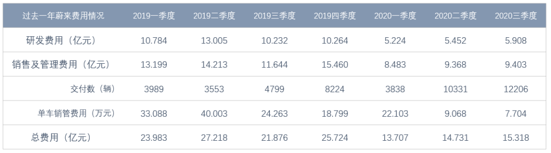 財報显示,2020年第三季度,蔚來用於研發的費用為5.908億元,2019年同期為10.232億元。