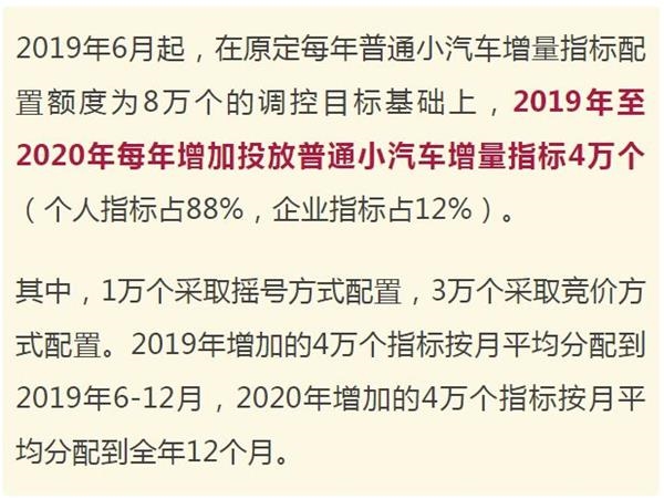 每月個人車牌搖號和競拍指標分別由原定的各2933個增加為4190個和6704個,每月單位車牌搖號和競拍指標分別由原定的各400個增加為571個和914個。