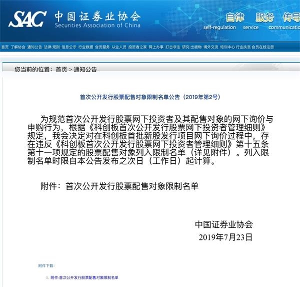 7月23日晚間,中國證券業協會發布公告稱,決定對在科創板首批新股發行項目網下詢價過程中,將存在違規的股票配售對象列入限制名單。列入限制名單時限自本公告發布之次日(工作日)起計算。