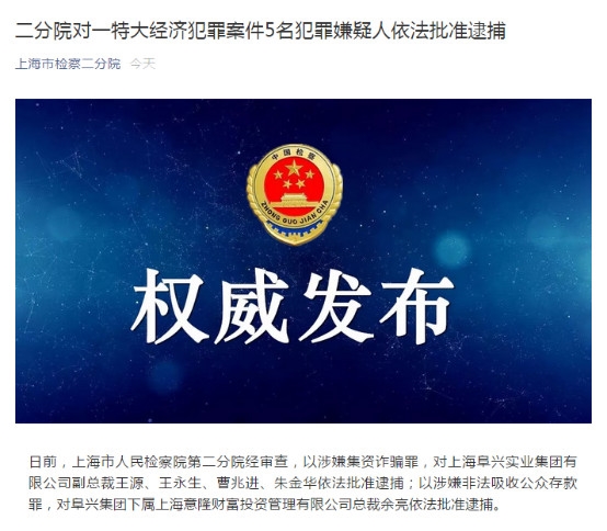 5月8日,上海市人民檢察院第二分院發布消息稱:“日前,上海市人民檢察院第二分院經審查,以涉嫌集資詐騙罪,對上海阜興實業集團有限公司副總裁王源、王永生、曹兆進、朱金華依法批准逮捕;以涉嫌非法吸收公眾存款罪,對阜興集團下屬上海意隆財富投資管理有限公司總裁余亮依法批准逮捕。”