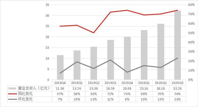 2020Q3,得益於非遊戲業務的強大驅動力,B站總營收達到了32.26億元,同比高增74%,這一增速是公司自2018年二季度首次突破10億后第三高的增速,與19Q4的差距僅在零點幾個百分比之內。